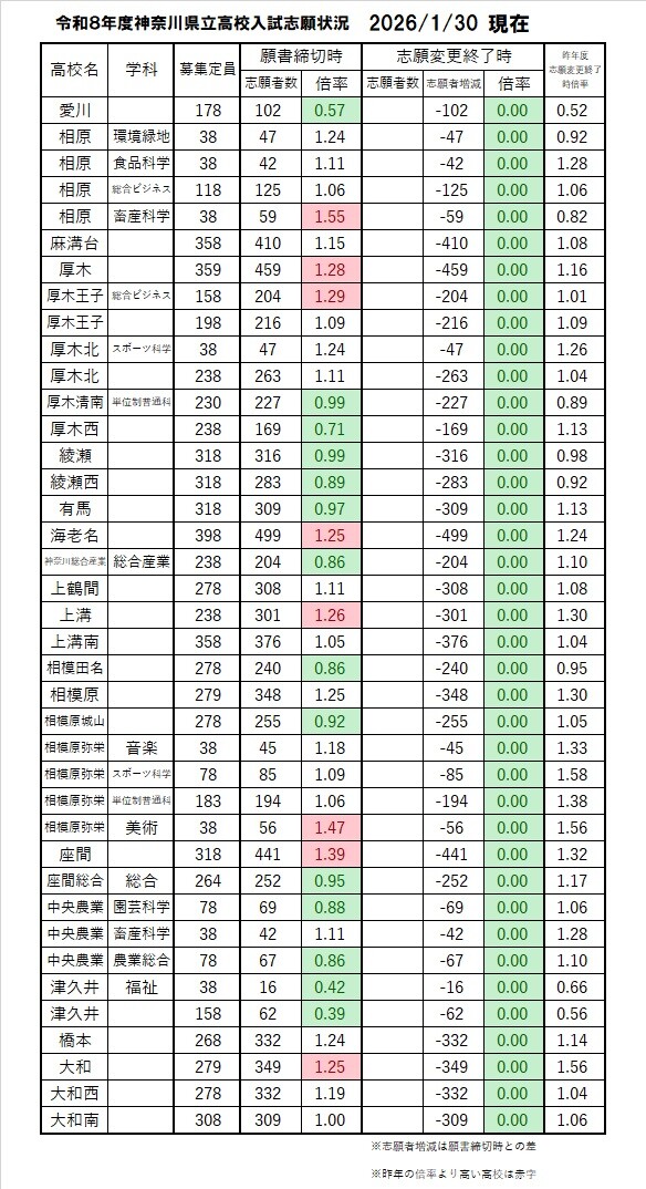令和8年度神奈川県立高校入試倍率(志願変更1日目終了時)